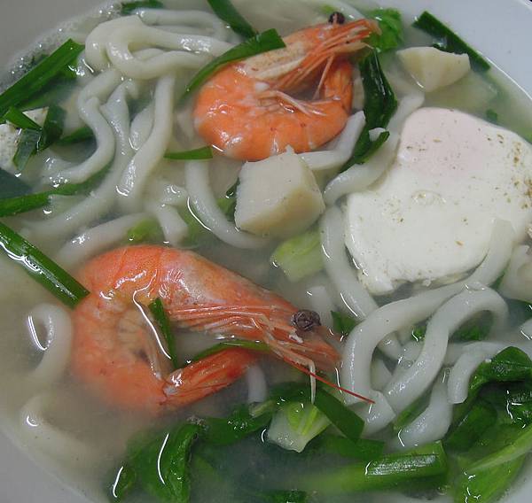 海鮮烏龍麵加個幾尾蝦和生干貝,然後打個蛋加肉片和青菜